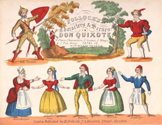 Toy‑theatre adaptations of major literary works were common in the Victorian era, particularly stories rich in adventure, spectacle and comic incident, qualities that made Don Quixote especially suitable. While many Pollock titles were drawn from contemporary melodramas, Don Quixote belonged to a smaller group of plays adapted from well‑known novels and romances, reflecting the period’s enthusiasm for bringing classic literature into the domestic playroom.
