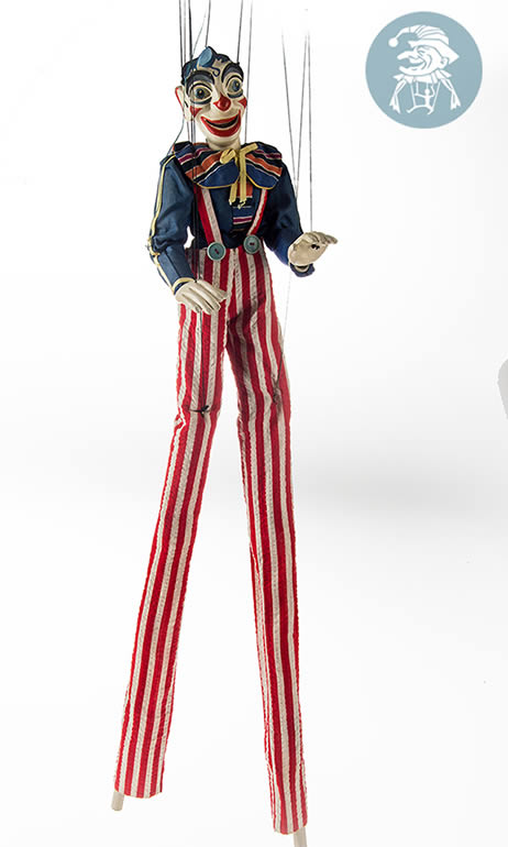 The Stilton Bros stilt‑walkers were among the final puppets created for the Lanchester Grand Circus. Designed and made by Frank Rose in his distinctive style, the troupe comprised four brothers in total, with the example shown here being the 3rd tallest. The tallest brother was represented solely by an elongated pair of legs!