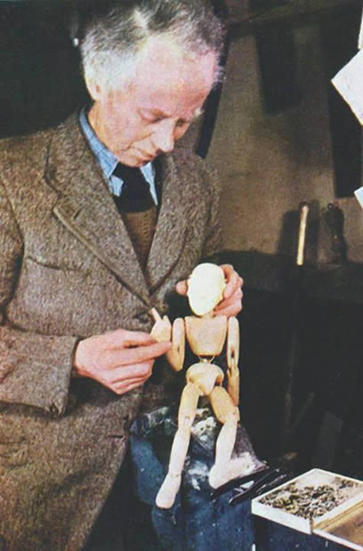 In 1938, filmmaker Douglas Fisher produced an instructional film documenting Waldo Lanchester’s process of creating a marionette. The film demonstrates each stage of construction, including the design, carving, assembly, costuming, and stringing of the puppet. Close‑up shots capture the detailed craftsmanship involved, such as joint construction, carving techniques, and painting, alongside the making of the costume by Lanchester’s wife, Muriel. The film concludes with the completed marionette, along with a second replica, being manipulated to showcase how the precision of the making process translates into expressive movement. The puppets were slightly smaller than Lanchester’s usual 18‑inch figures at 15 inches, adapted to meet the practical constraints of filming.