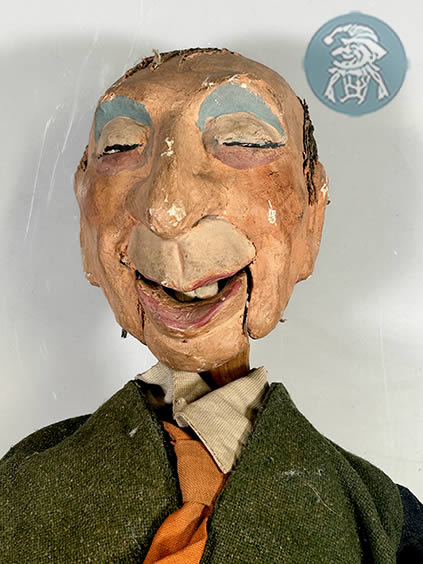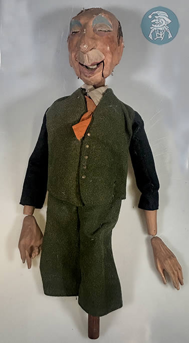 This male rod puppet was created by Harry Whanslaw, founder of the Guild. Although the character and production it belonged to are unknown, the figure reflects Whanslaw’s characteristic craftsmanship. It is carved from lime wood with a plaster coating.