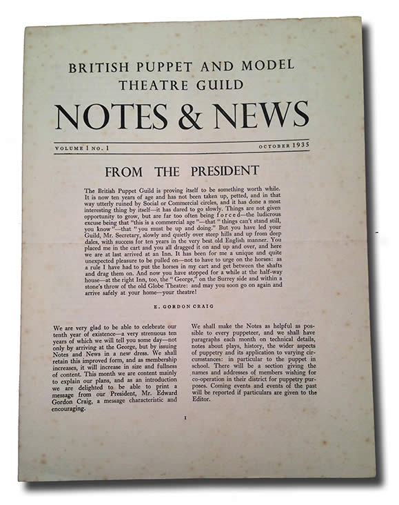 In 1935, the Guild marked its tenth anniversary with two significant developments: a move to new premises at The George Inn, Southwark, and a redesign of its newsletter and member correspondence, Notes and News. The Guild announced its intention for the publication to be “as helpful as possible to every puppeteer,” promising monthly features on technical matters, playwriting, puppetry history, and the wider applications of the art form.